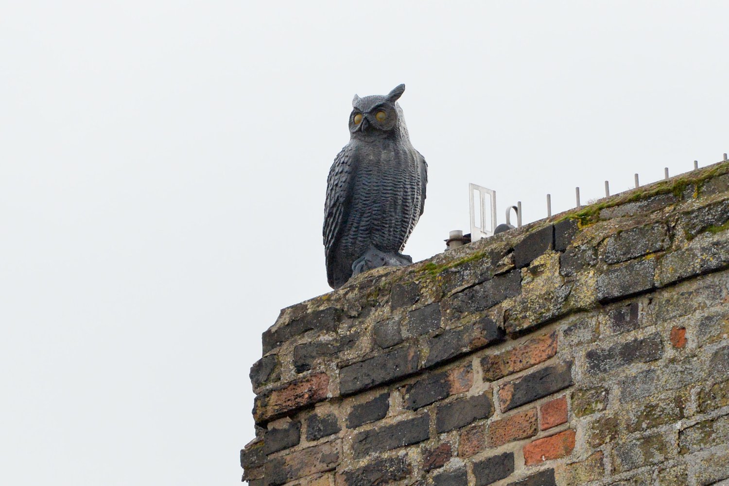 Replica owls can sometimes be found on rooftops to scare off other birds and predators. This example sits on the roof of 64 Fore Street.