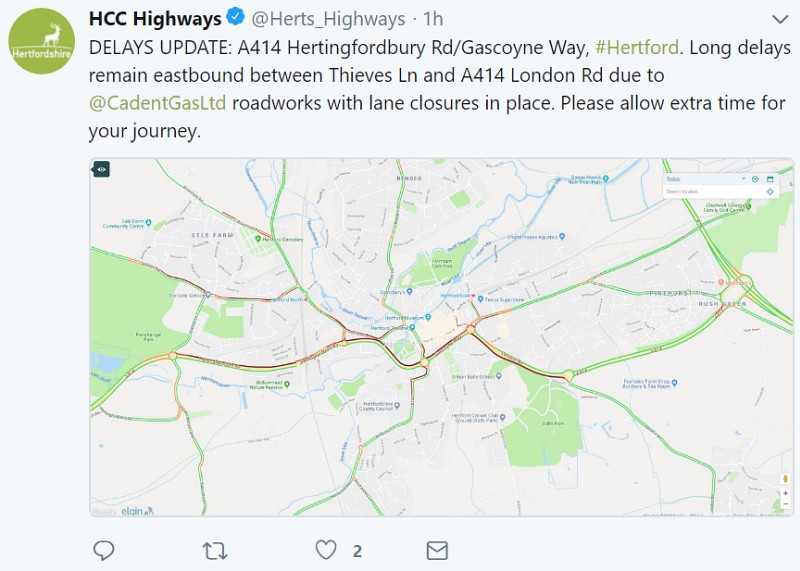 The gas mains replacement works are being carried out by Cadent and involve closing one lane of the A414 southbound until the end of the week. However, no work is actually taking place in the road.