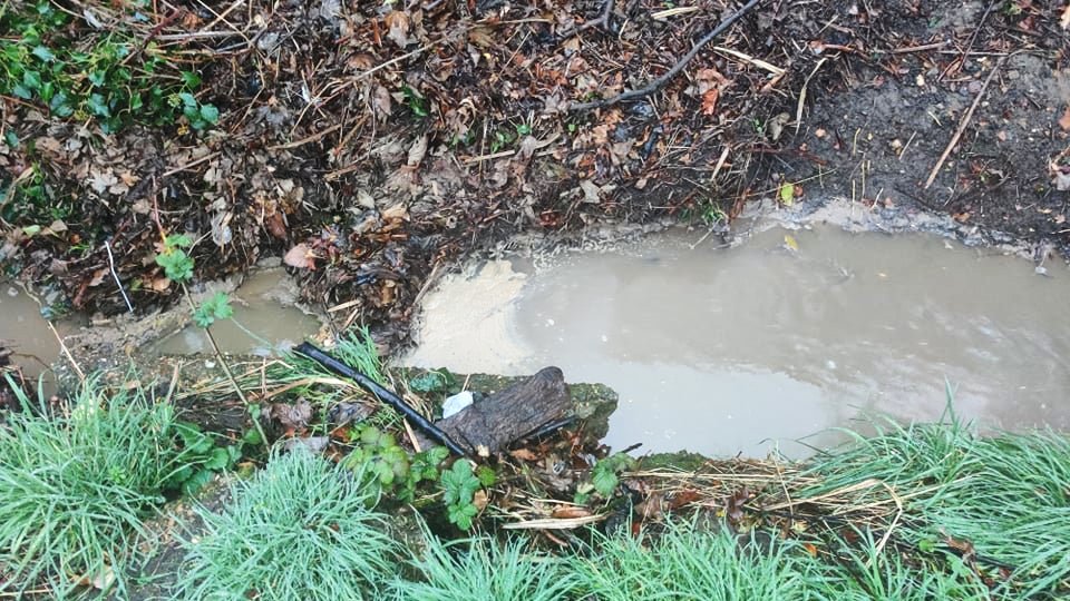 By Thursday afternoon water was running clear in the gully, although some evidence of pollution was still visible. Water from the gulley discharges in to a channel on the Meads.