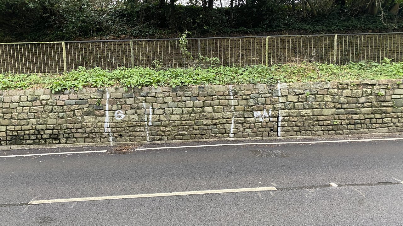 The pedestrain footway on the west side of the hill is raised above the road, with the retaining walls keeping it in place.