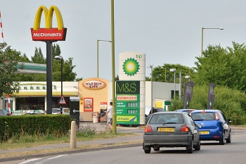During peak hours cars queueing for services regularly back up around the roundabout, presenting a hazard to the traffic flow.