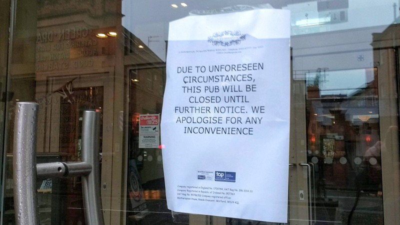 The Wetherspoons free house was closed on Sunday, with notices posted in the windows saying that the pub would be closed until further notice.